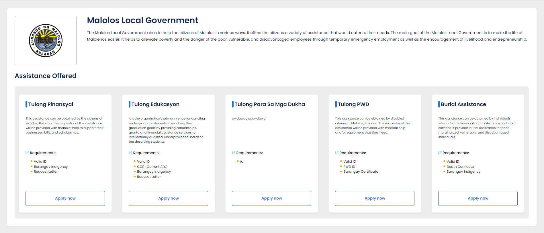 In summary, "Gabay Tulong Para sa Lahat ng Maloleno" is a digital solution designed to connect, empower, and support the Malolos community. This website aims to simplify the process of seeking and offering assistance while promoting transparency and accountability. By fostering collaboration and kindness, we aspire to make Malolos a more connected and caring community. Together, we can build a stronger, more supportive future for all residents. Thank you for being a part of this endeavor.