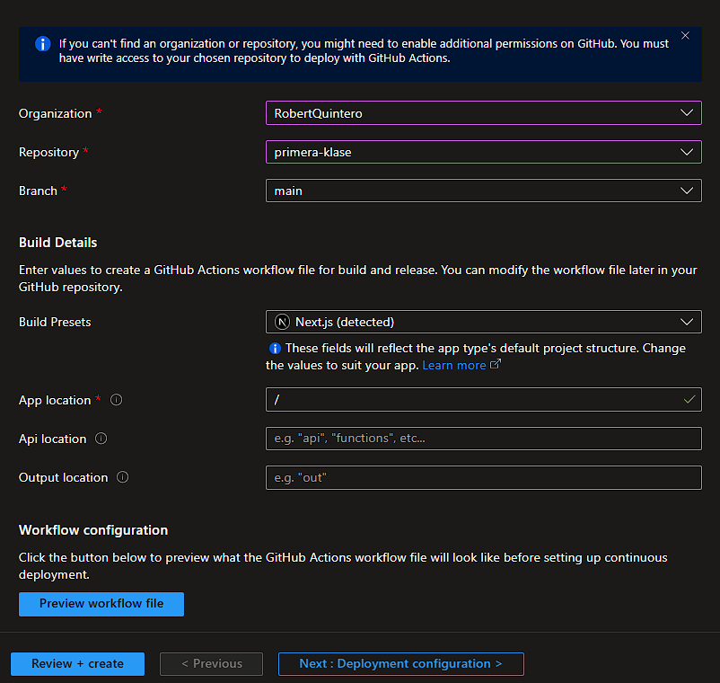 Azure Static Web Apps provides a straightforward GitHub integration, enabling continuous deployment with GitHub Actions. After creating the app, I connected it to my GitHub repository, where I store my site’s source code. Azure generated a workflow file for GitHub Actions, which defined the steps needed to build and deploy the app automatically.